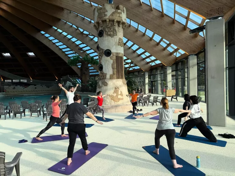 The tropical dome: 4 500 m2 greenhouse with wave pool, 11 slides, 250 m wild river, jacuzzi and children's pool in a tropical setting with palm trees and coconut trees.