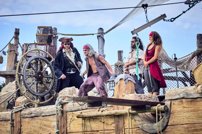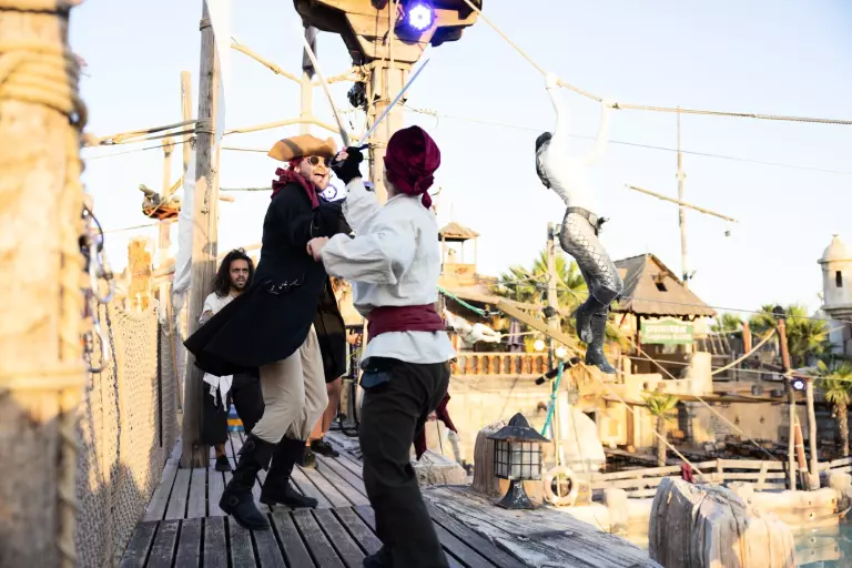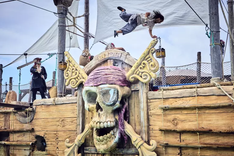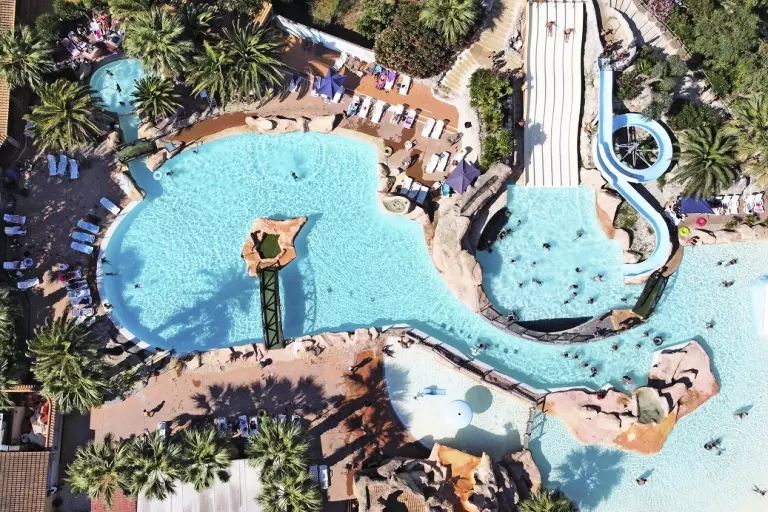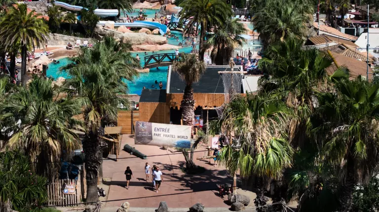 - Immense 10 000 m2 water park on the theme of pirates (in high season: Californian zone + open pirate zone; in low season: only the heated Californian area remains accessible) : 6 pentagliss, 4 slides, 2 paddling pools, 1 gigantic Pirate boat, 1 hot tub, 1 wave pool, buoyed river
